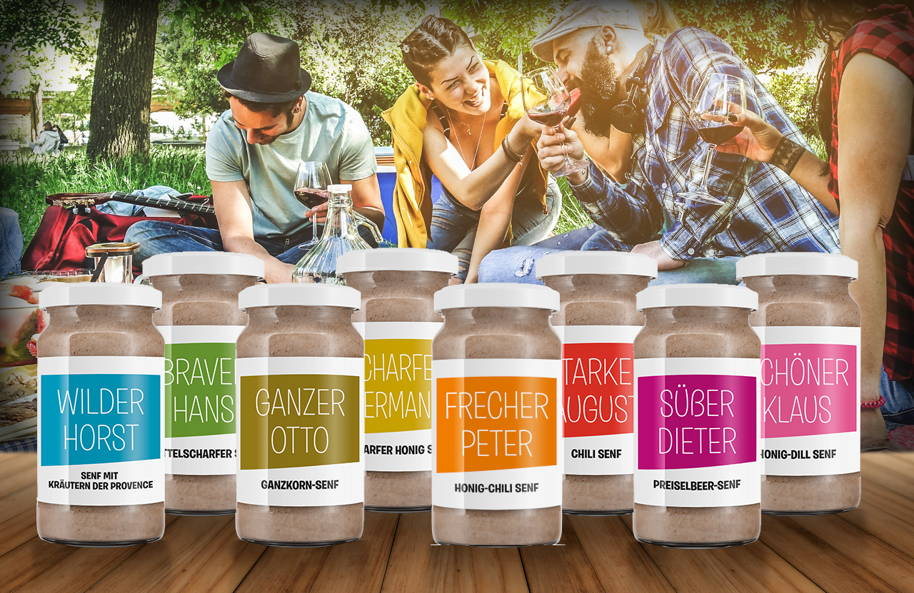 Das scharfe Trio zusammen mit unseren beiden Senfsorten zu Käse und Fisch, Süßer Dieter und Schöner Klaus, das sind unsere scharfen, süßen Burschen! Scharfer Hermann, Frecher Peter und Starker August sind für alle, die Schärfe mögen und vom Essen noch etwas schmecken möchten. Süßer Dieter überrascht mit angenehmer Fruchtgkeit und einer leichten Schärfe im Abgang, während Schöner Klaus mit seiner Kombination aus Honig und Dill Räucherfisch und Lachs veredelt.